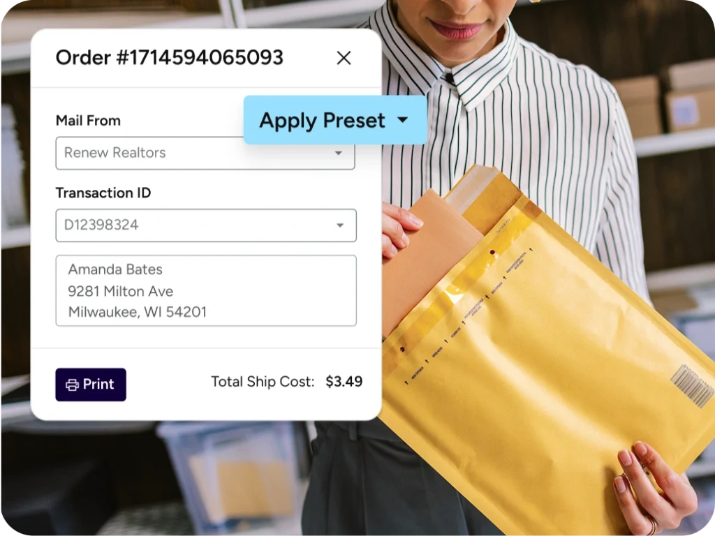 Close the deal. Send professional, branded mail that reflects your agency’s reputation—from offer to close. Print polished labels and custom postage, deliver welcome kits or closing gifts on time, and share live tracking updates so clients feel informed and confident every step of the way.
